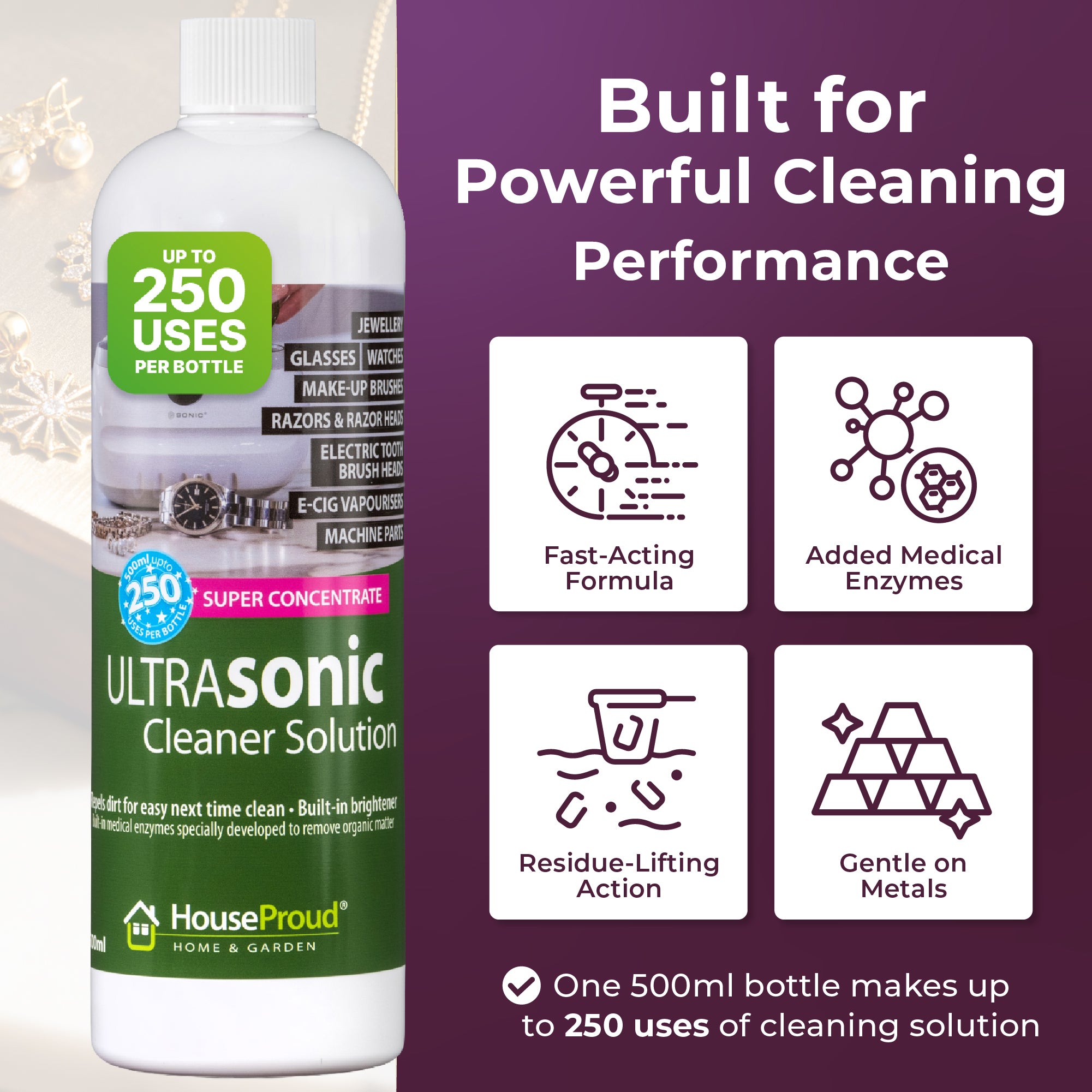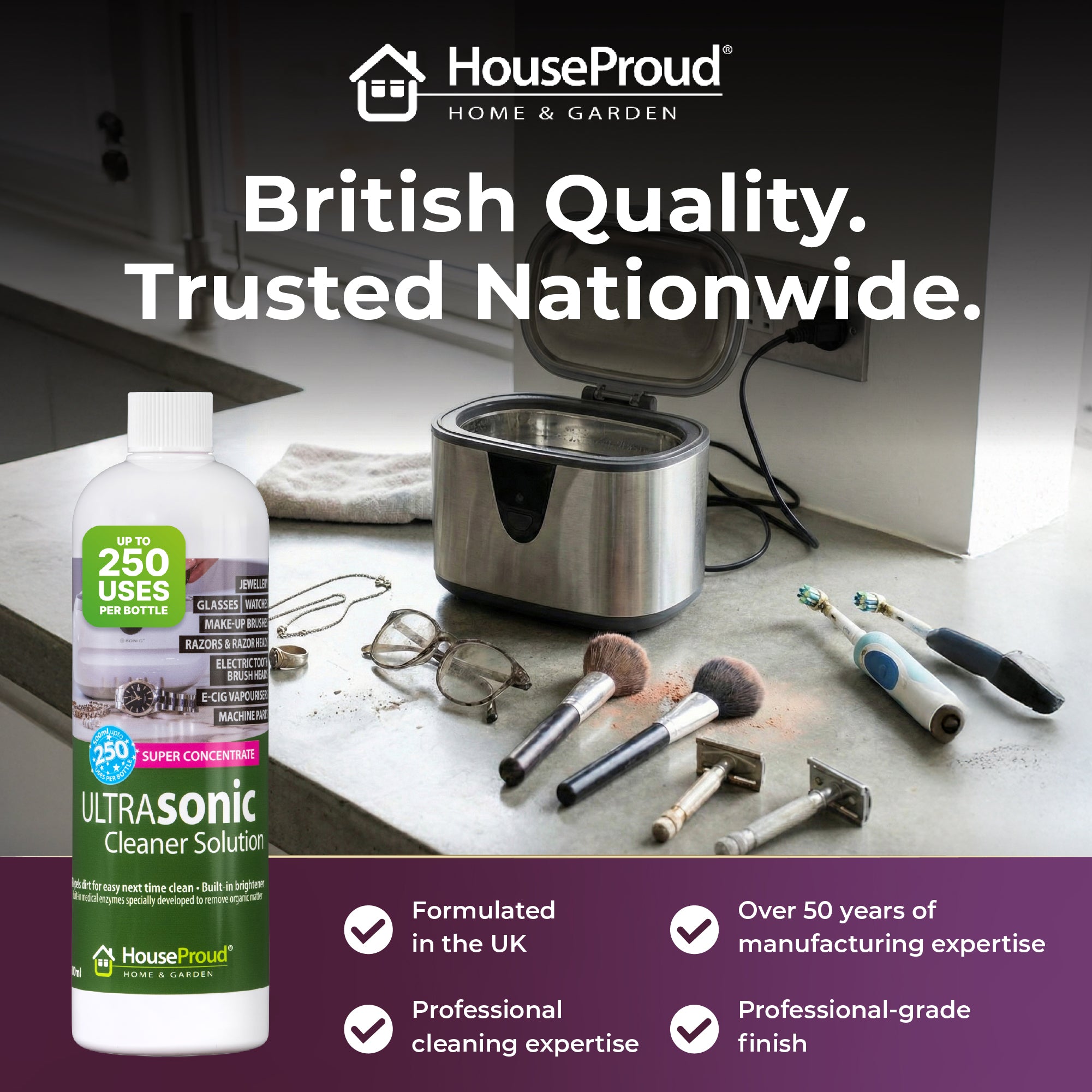 Expertly Made In The UK: Trusted professional-grade quality. Formulated using the standards of a long-established professional medical cleaner, HouseProud’s concentrated ultrasonic cleaner is designed and manufactured in the UK, backed by over 50 years of chemical expertise.