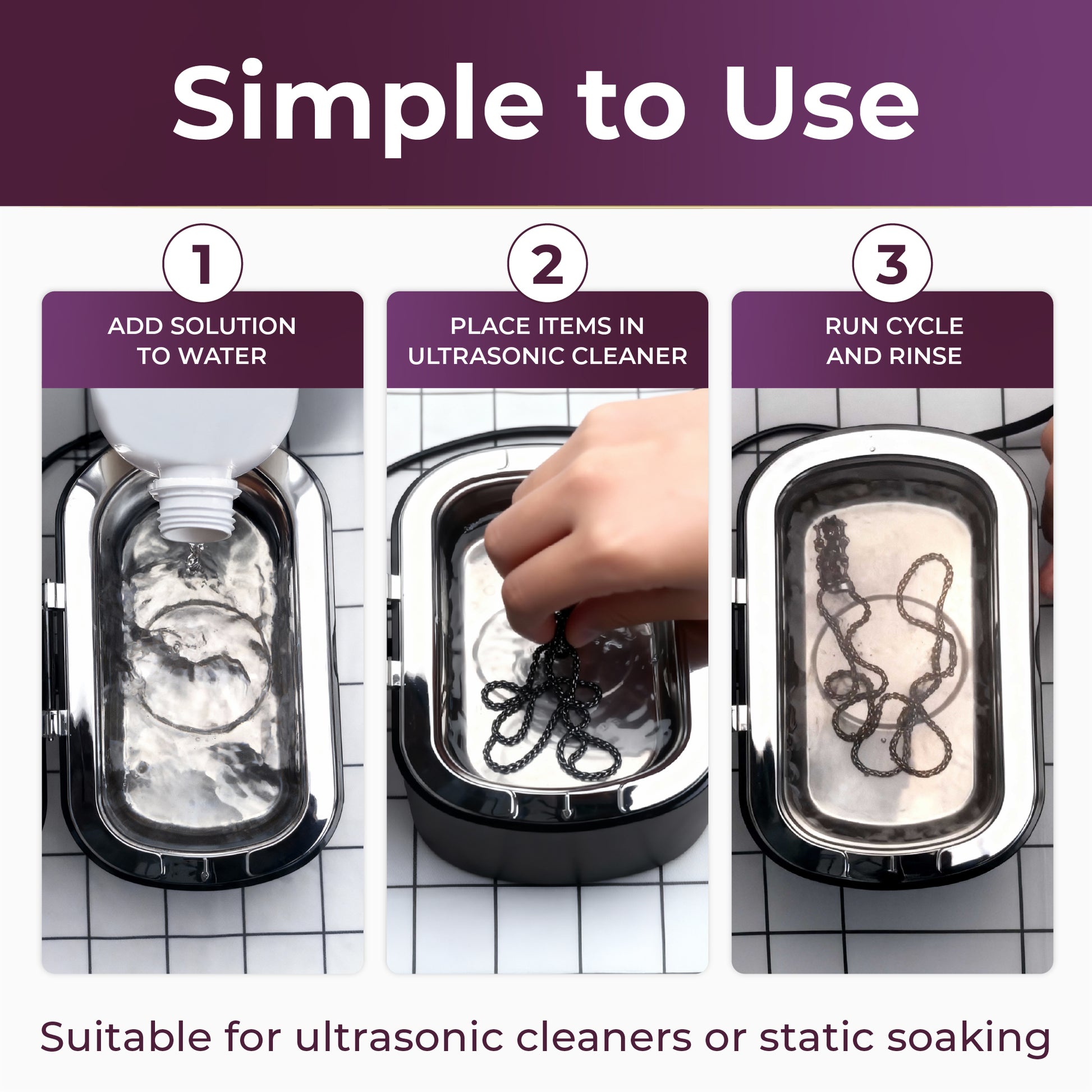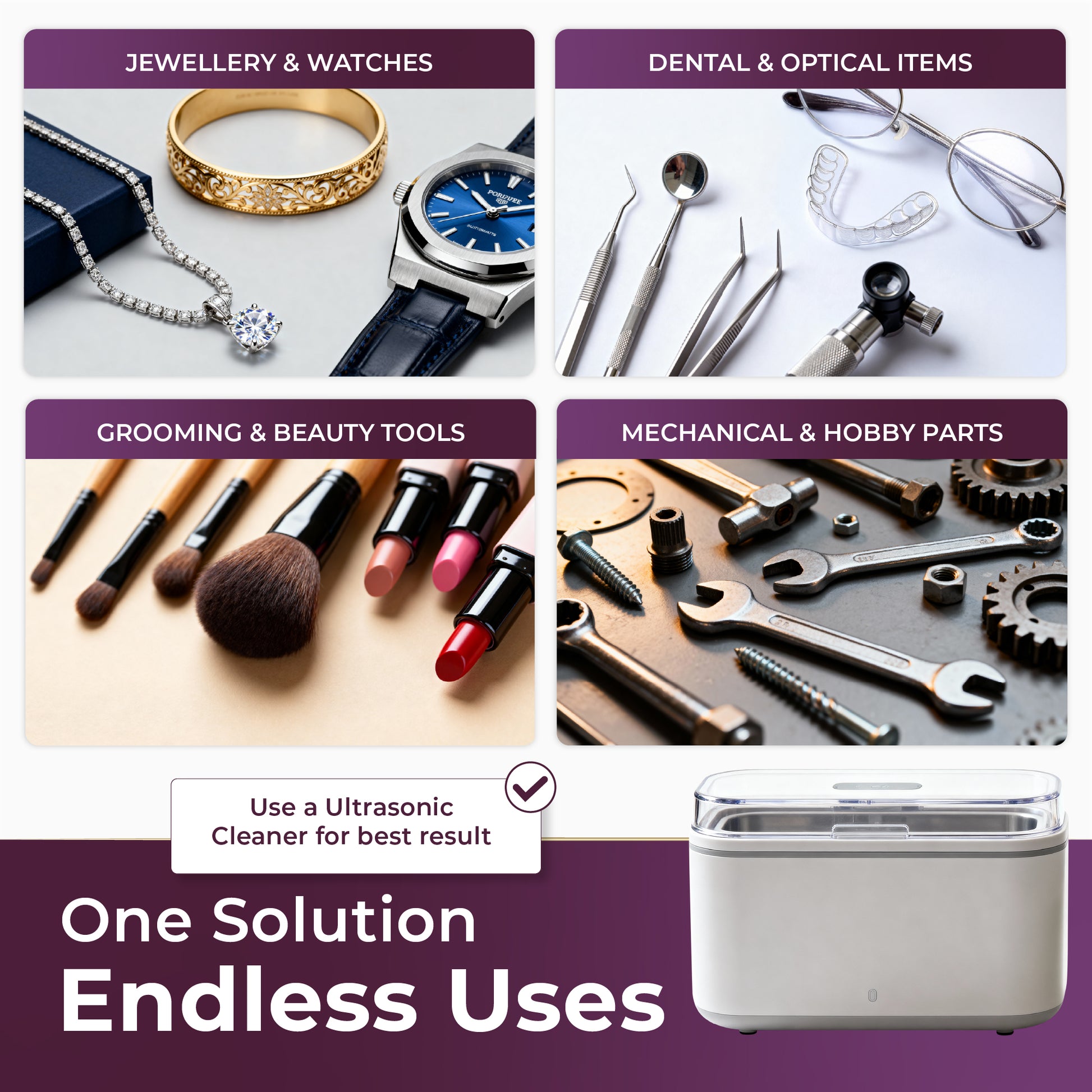 Versatile Multi-Purpose Solution: One concentrated cleaner for everything. Safely and effectively deep-clean your retainers, dentures, spectacles, watches, jewellery, makeup brushes, electric toothbrush heads, shaver heads, bicycle parts, vehicle components, and more in your ultrasonic bath.