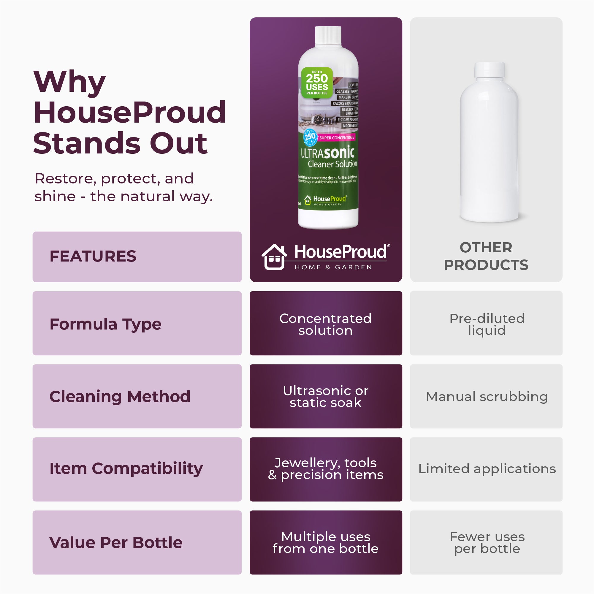 Stop settling for less. Upgrade your cleaning routine with professional power, superior value, and dazzling results from HouseProud Ultrasonic Cleaning Solution.