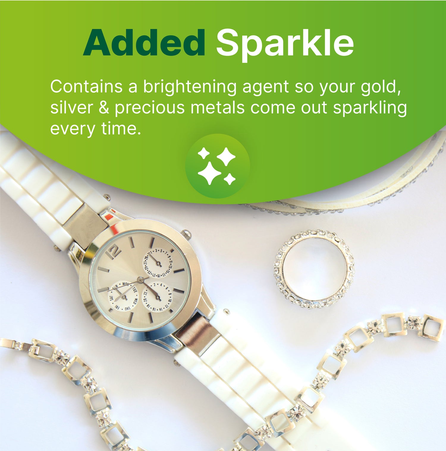 Sparkling Jewellery Cleaner: Gentle yet highly effective, this specialist ultrasonic liquid is perfect for restoring shine to precious metals and stones. Featuring a built-in water softener and brightener, it leaves gold, silver, and rings looking brand new (please do not use on pearls).