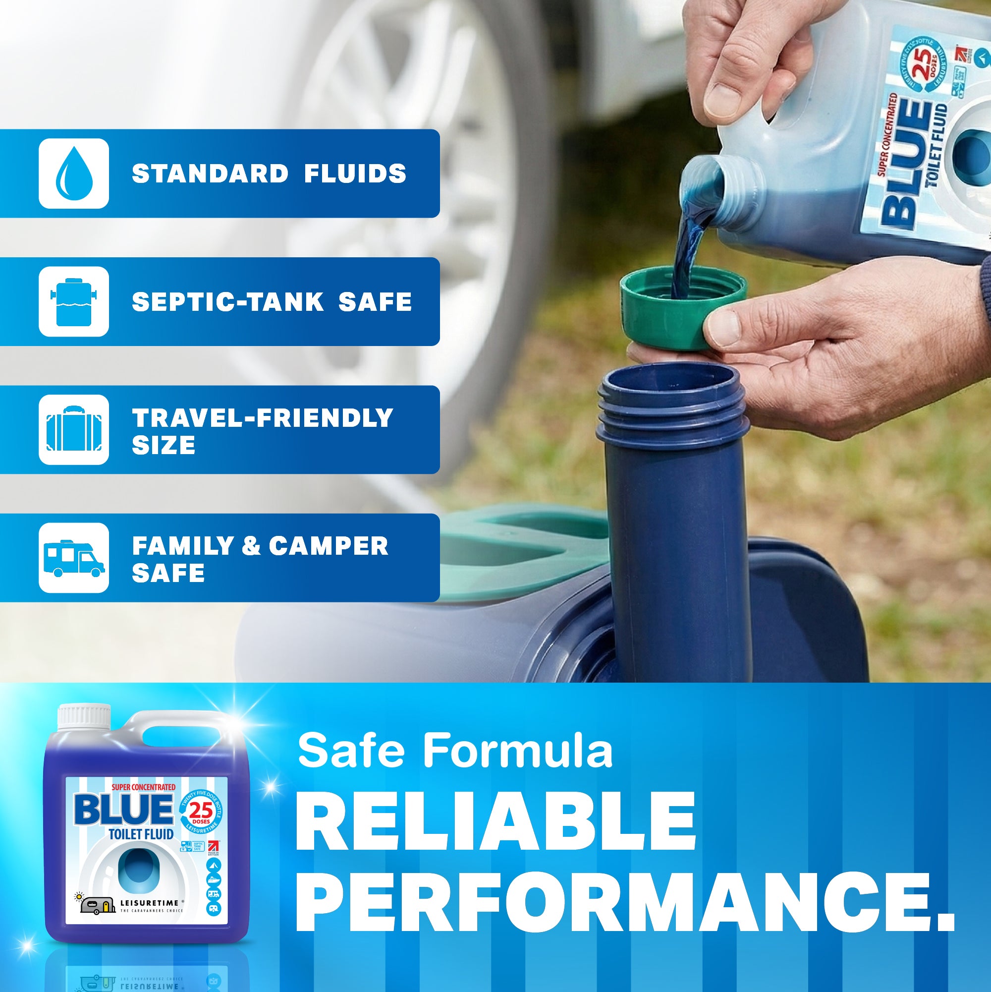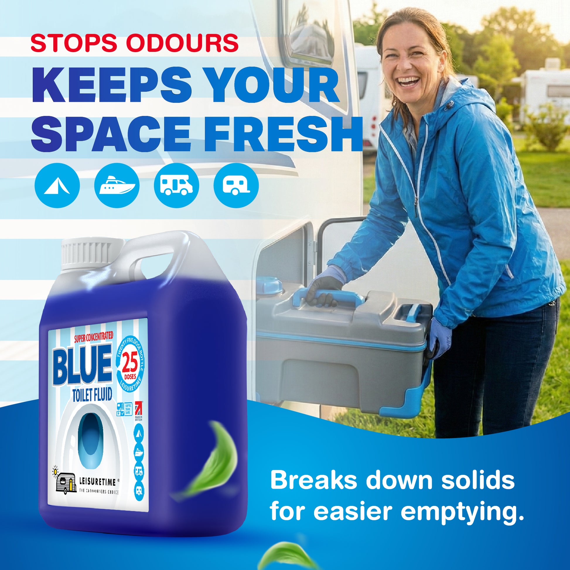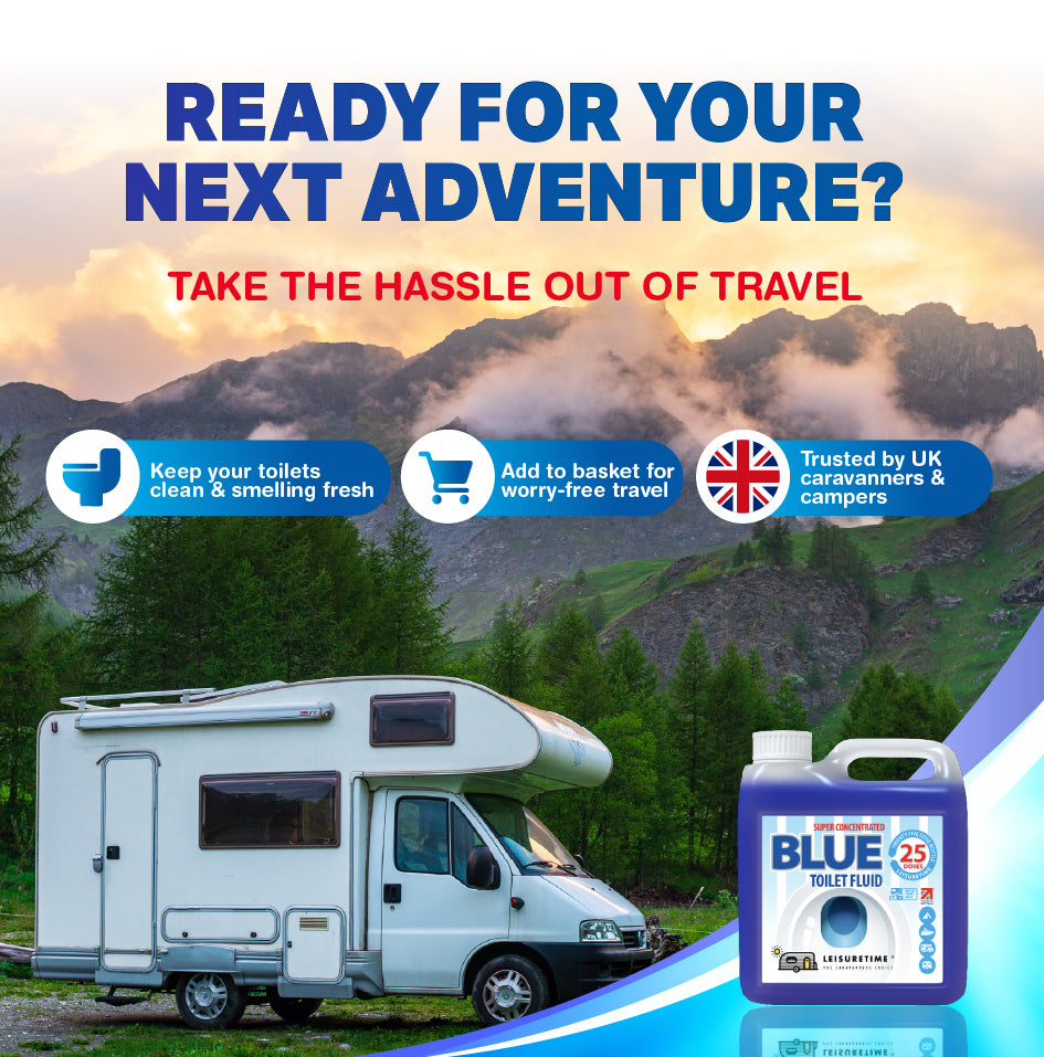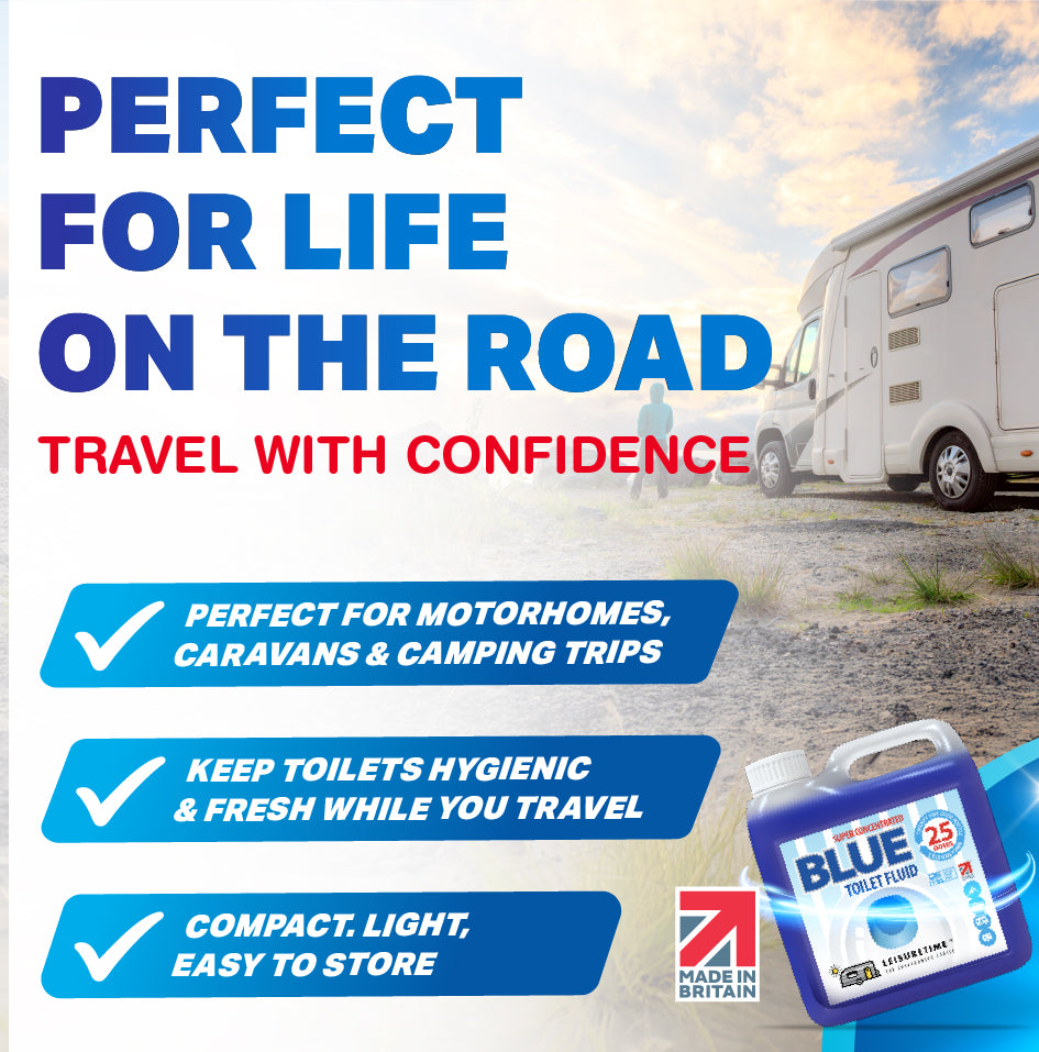 Concentrated Blue Toilet Fluid for Caravans & Motorhomes. LeisureTime Blue Toilet Fluid efficiently breaks down waste and prevents unpleasant smells in all portable toilets. Save money, space and weight with our super-concentrated formula which gives 25 treatments - 5 doses more than your average bottle – all from a compact 1 litre bottle.
