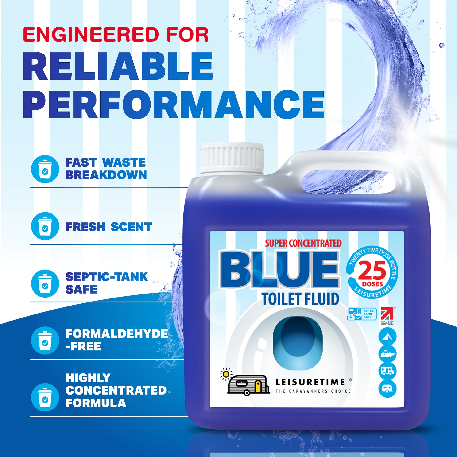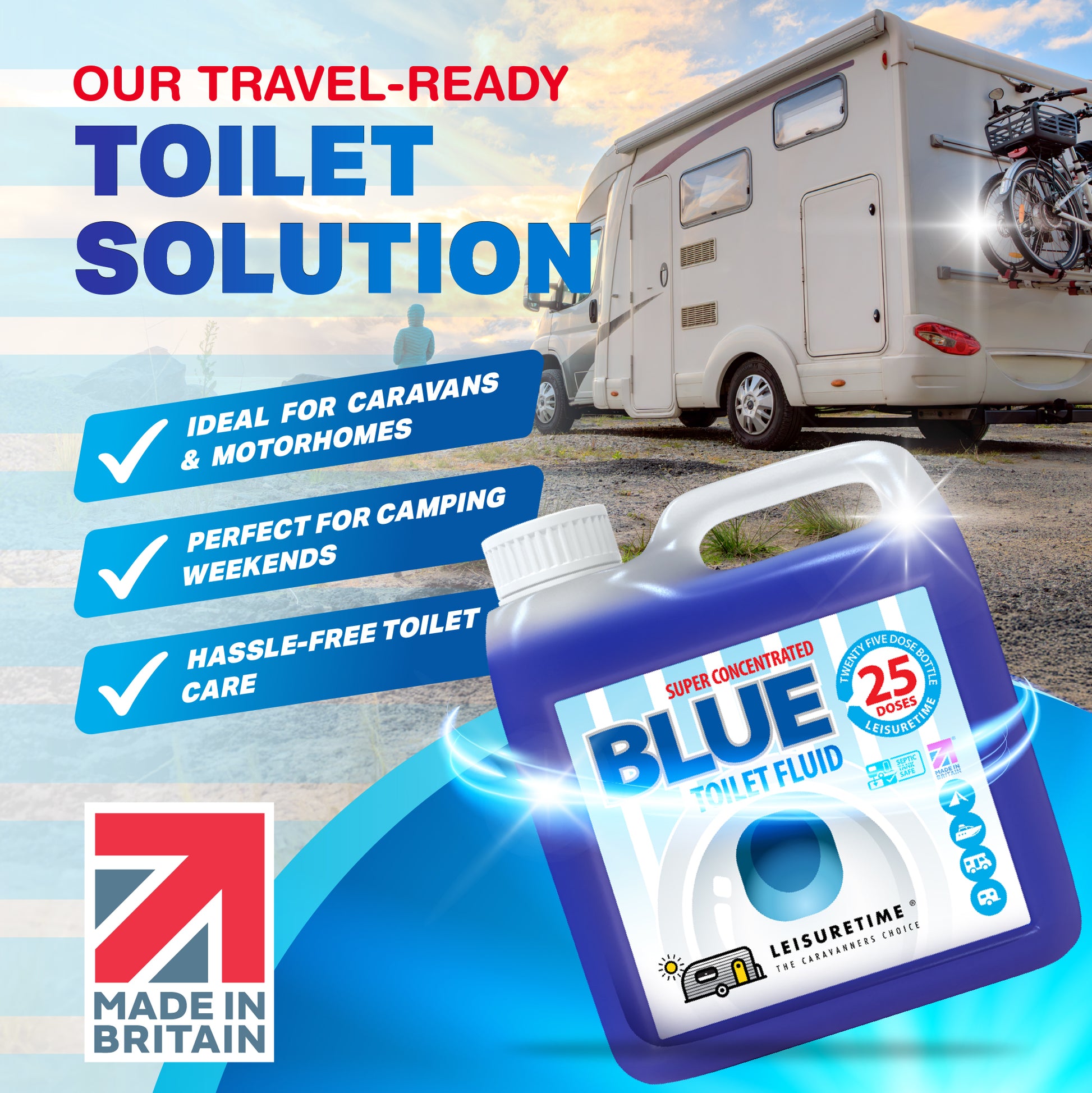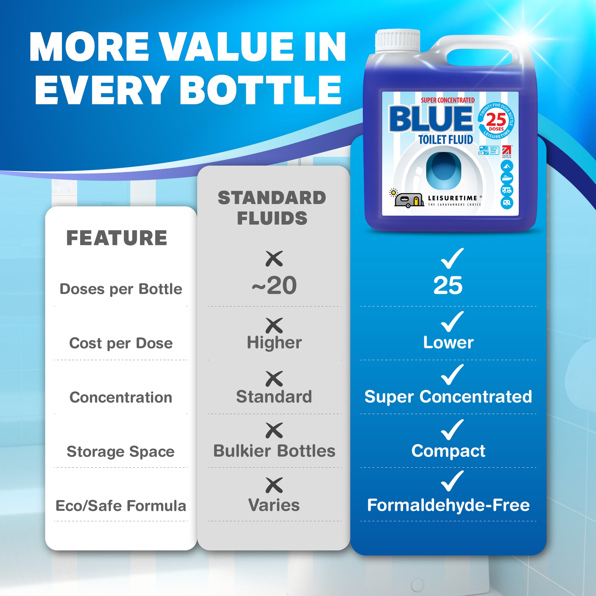 Concentrated Blue Toilet Fluid for Caravans & Motorhomes. LeisureTime Blue Toilet Fluid efficiently breaks down waste and prevents unpleasant smells in all portable toilets. Save money, space and weight with our super-concentrated formula which gives 25 treatments - 5 doses more than your average bottle – all from a compact 1 litre bottle.