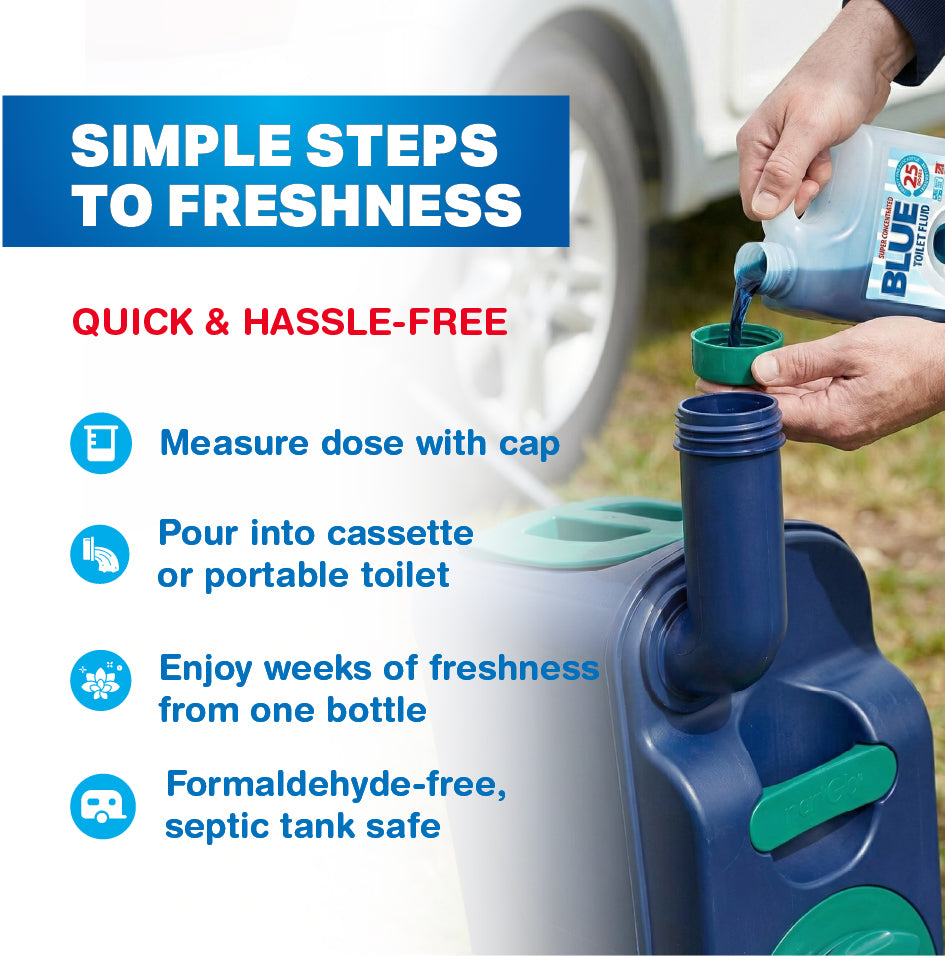 Easy to Use. LeisureTime Blue Toilet Fluid is ideal for cassette toilets in caravans and motorhomes, as well as in boats & barges, and for campers using porta-potti/portaloo toilets. Just add 40ml per 10L of tank capacity, with a minimum of 2L of water while ensuring any solid waste is covered. Repeat every 3-4 days, or as needed.